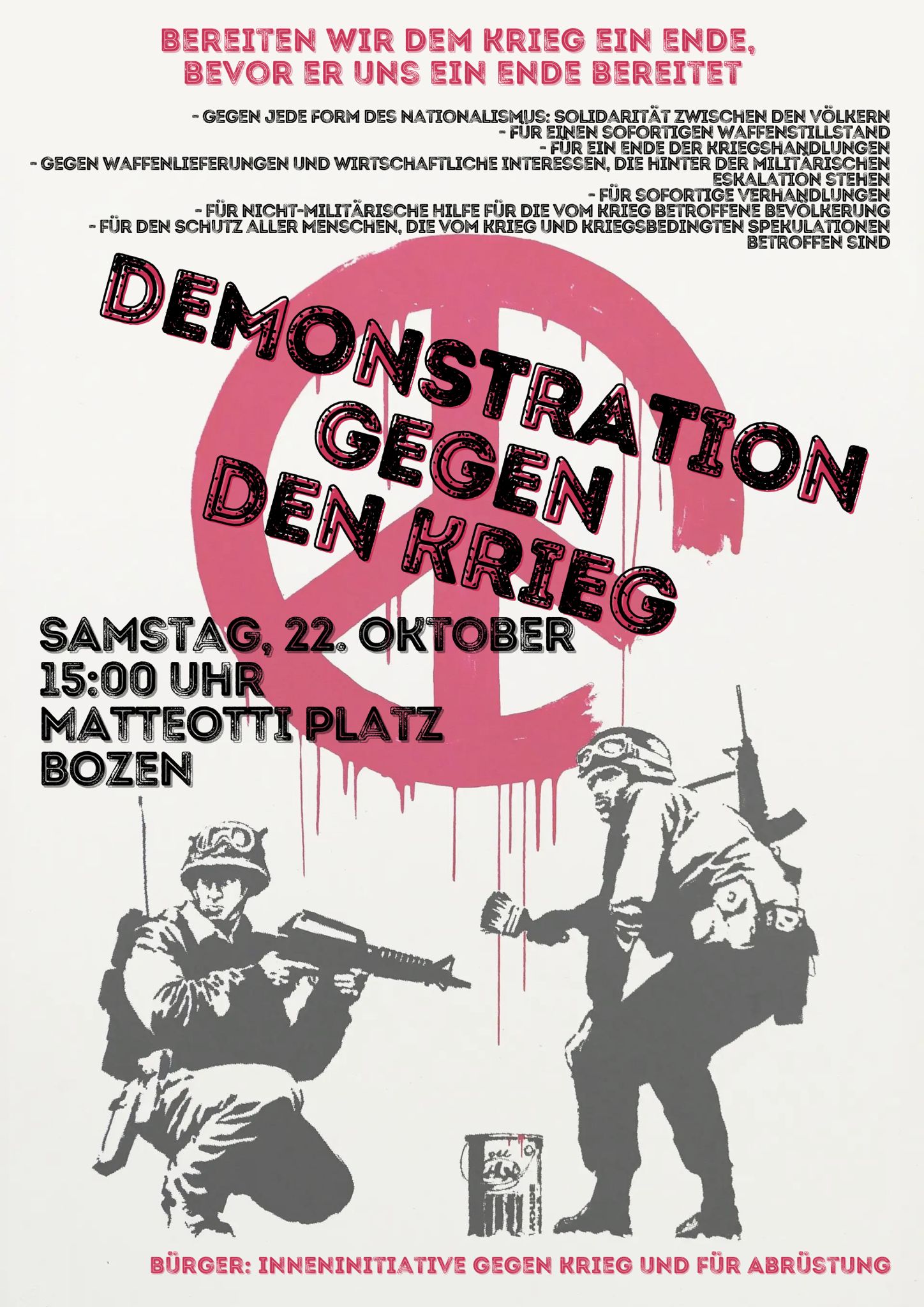 In Einklang mit der nationalen Initiative des Nezwerkes für Frieden und Abrüstung lädt CGIL AGB zur Teilnahme an der Kundgebung der Bürger: inneninitiative gegen Krieg und für Abrüstung Bozen ein: