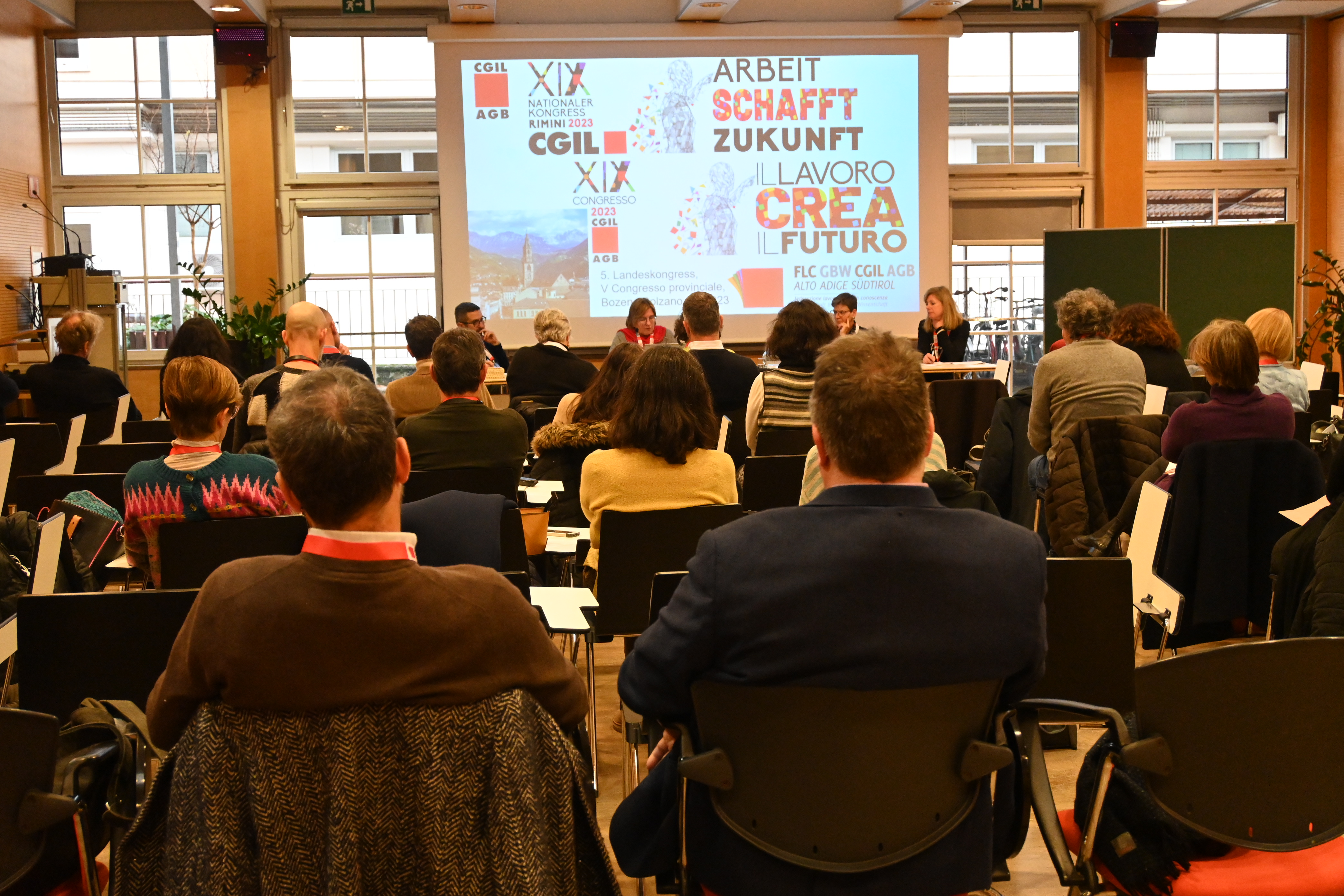 Am Kongress haben rund 30 Delegierte, die Vertreterin der nationalen FLC Manuela Calza und die Generalsekretärin des AGB/CGIL auf Landesebene, Cristina Masera, teilgenommen.