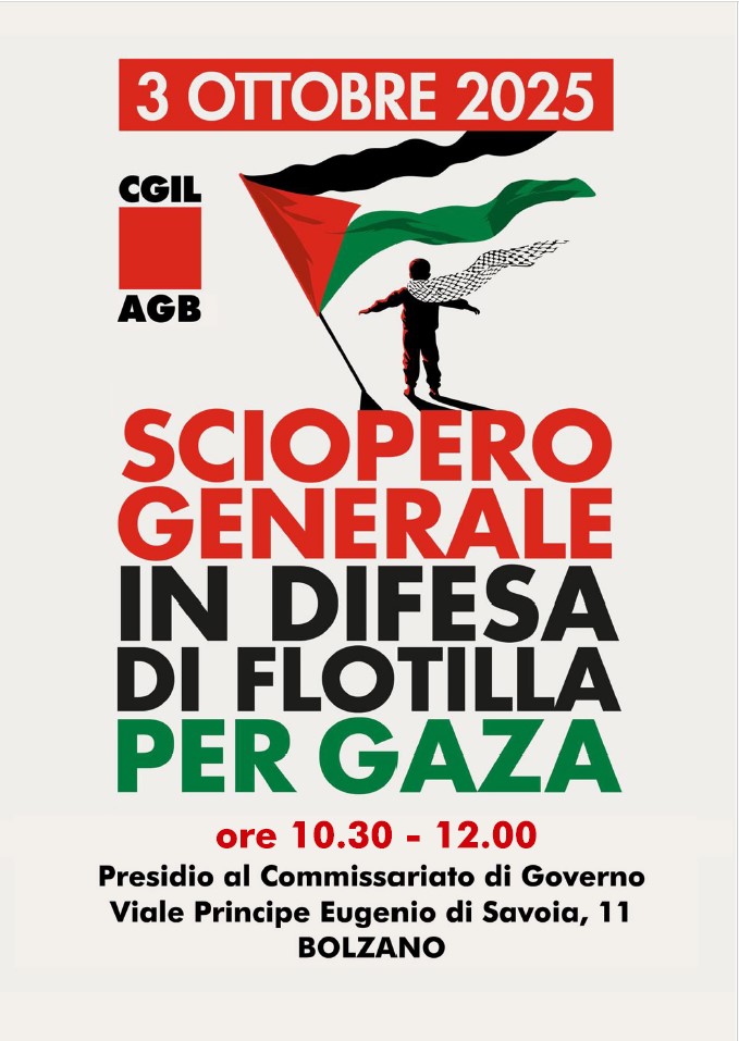 3 ottobre 2025 10:30-12:00 Presidio al Commissariato del Governo, Viale Principe Eugenio 11, Bolzano In sciopero per l’intera giornata … leggi di più ...